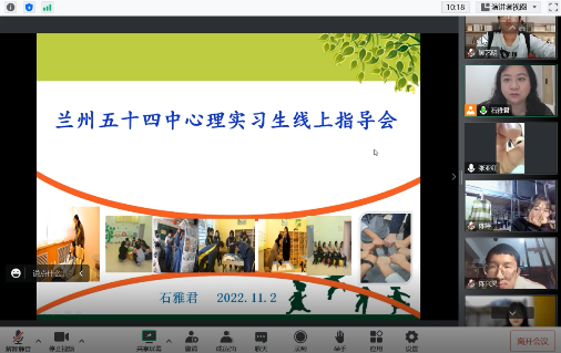 启动会上,两位老师对于实习生们来兰州市第五十四中学参与实习表达了热烈的欢迎。首先,两位老师向同学们介绍了五十四中学心理健康课程的历史,作为兰州市最早开设心理健康课程的学校,五十四中学对于心理健康十分重视。同时,在不断的发展与完善中,也取得了很多成绩,为兰州市以及甘肃省的心理健康工作做出了很大贡献。随后,实习生们在两位老师的带领下在云端参观了五十四中学在心理健康方面的设施和工作设置。相信在两位富有经验且责任心强的老师带领下,所有实习生都能够在实习过程中收获颇丰。