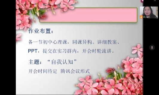 最后,老师布置了本次实习的第一项实践作业——以 “自我认识”为主题进行同课异构的教学设计,并在后期会议中展示。