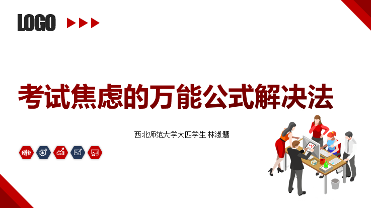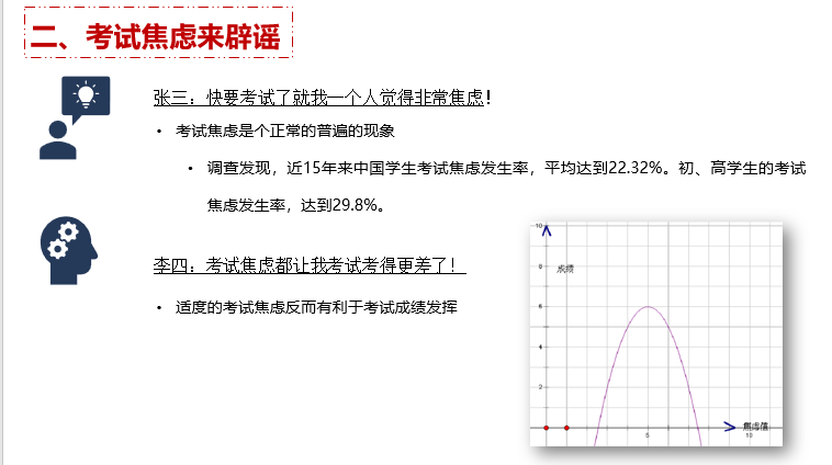 我课程设计的思路是从考试焦虑的例子引入考试焦虑的定义,从一些可能出现的错误判断来加深理解。再重点讲解考试焦虑的解决方式。在展示中,很感谢其他同学和老师的点评,让我看到了自己不足的地方和可以改进的地方。