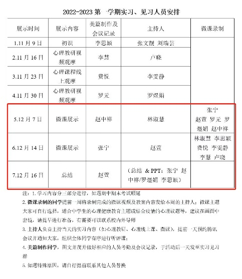 首先在张文靓老师和刘瑞芸老师的带领下,根据时间和任务情况来规划了我们的实习任务。心健老师最基本的就是工作就是上课。上课设计课程就从先听课评课开始。在实习中,听课可以分为听教研课、听指导老师课程、听微课。