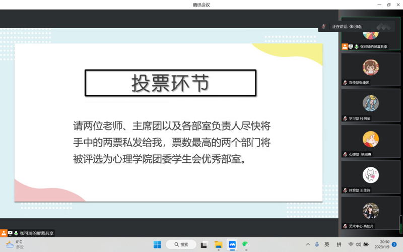 接下来进行投票环节,综合各部室2022-2023学年第一学期的工作成果总结,本着公平公正的原则,宣传部和学习部被评选为必发9988集团团委学生会优秀部室。