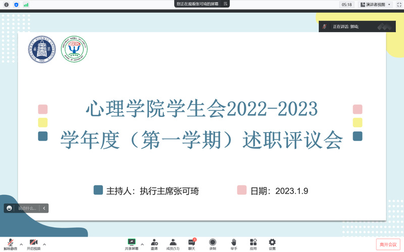 为展示工作成效、提升学生会工作能力、增进学习交流、开展自查自纠、深化改革创新、促进内涵发展的重要契机。2023年1月9日,必发9988集团举行2022-2023学年度第一学期学生会述职评议会。必发9988集团团委书记郭琦,本科生辅导员林子皓老师,必发9988集团学生会主席团成员、各部室负责人及其部门干事参与会议。本次会议由必发9988集团学生会主席张可琦主持。