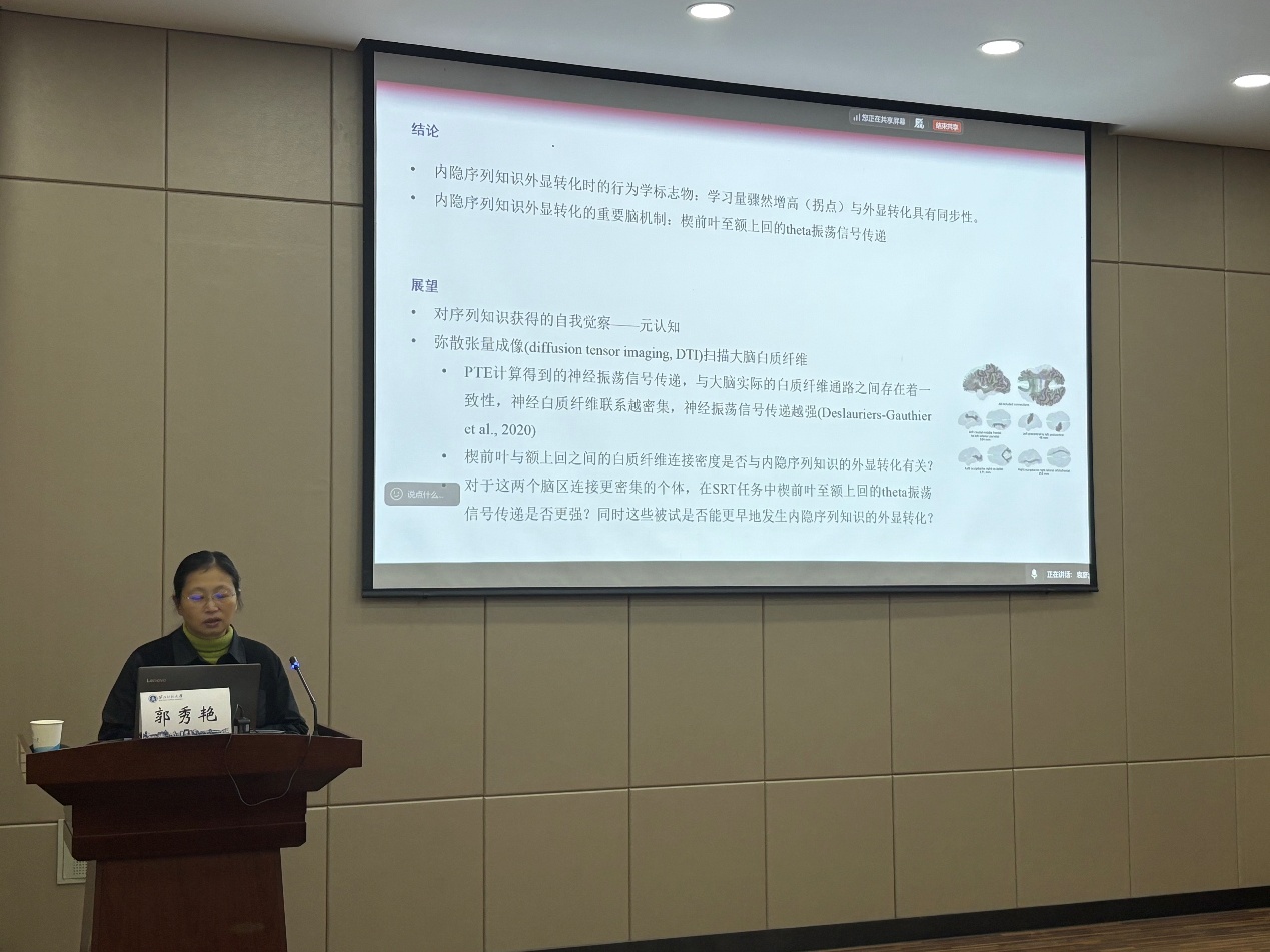 报告中,郭秀艳教授深入阐述了内隐序列学习及其外显转化这一认知心理学经典问题的最新研究进展。内隐学习是指个体在无意识状态下获得复杂知识的过程,而这些内隐知识如何转化为可以言说的外显知识,一直是认知科学领域的核心议题。郭教授系统介绍了团队采用序列反应时任务等经典范式,结合多模态脑成像技术开展的系列研究。