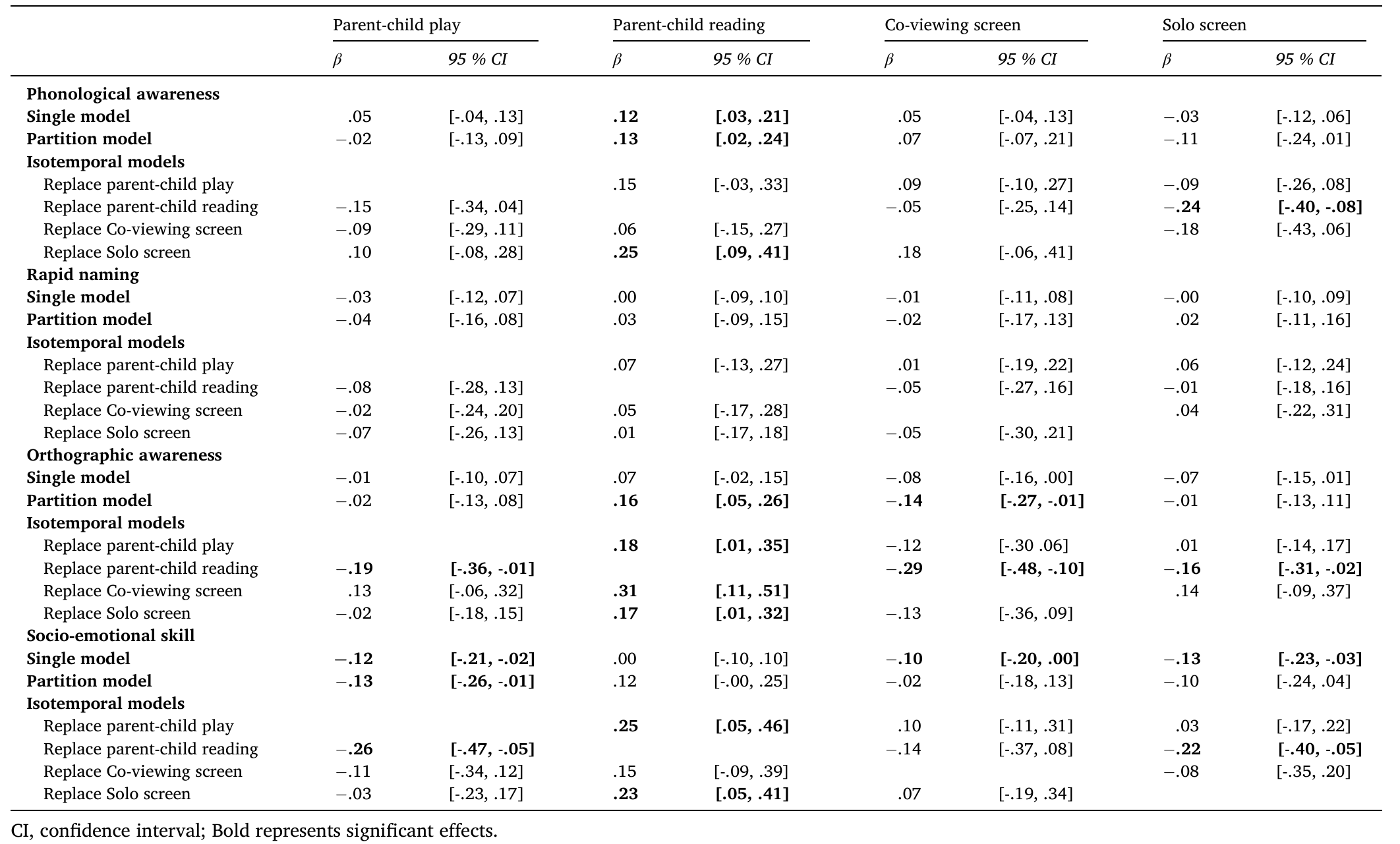 为考察在屏幕时代如何优化家庭环境支持并促进儿童良好发展,近日,西北师范大学李世峰副教授课题组在国际知名期刊Computers in Human Behavior(中科院一区Top,IF = 8.9)上发表了题为“Screens or books? Isotemporal substitution of different home activities on language and socio-emotional skills in preschool children”的学术论文。该研究基于等时替代模型,考察了亲子游戏、亲子阅读及屏幕时间(学习屏幕vs娱乐屏幕,独自屏幕vs亲子联合屏幕)相互替代与学龄前儿童语言和社会情感技能发展之间的关系。基于传统多元回归模型的研究结果显示总体上亲子阅读与儿童各项语言和社会情感技能的发展之间存在正向的联系,而屏幕时间与儿童各项语言和社会情感技能的发展之间存在负向的联系。等时替代模型分析的结果进一步显示:(1)使用等时的亲子阅读去替代相同时间的电子屏幕使用与儿童更好的语音意识、正字法及社会情感技能的表现相联系;(2)而用相同时间的屏幕时间替代亲子阅读则与儿童更差的语音意识、正字法及社会情感技能的表现相联系;(3)进一步区分屏幕时间为娱乐屏幕时间和学习屏幕时间或独自屏幕时候和亲子联合使用的结果重复了上述结果。