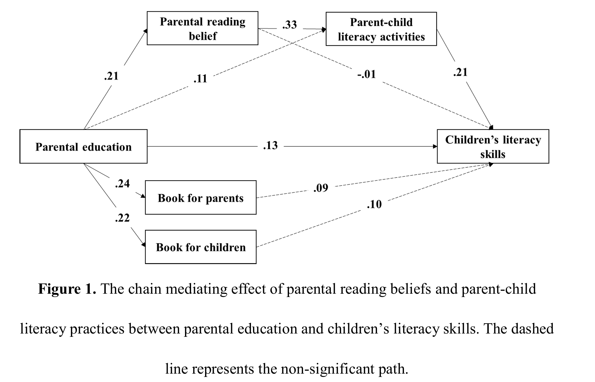 乡村儿童父母受教育水平、家庭图书量、父母阅读信念、父母读写参与及儿童的阅读技能。基于家庭社会经济资源代际迁移模型(intergenerational-transfer-of-socioeconomic-resources model)的路径分析显示,父母受教育水平通过父母阅读信念影响其参与度,进而作用于儿童的阅读技能发展。基于该研究的论文“Exploring the Role of Parental Education and the Home Literacy Environment on Literacy Development in Rural Chinese School-Aged Children”发表在了教育心理学(PSYCHOLOGY, EDUCATIONAL)领域的SSCI期刊《Journal for the Study of Education and Development》期刊上。