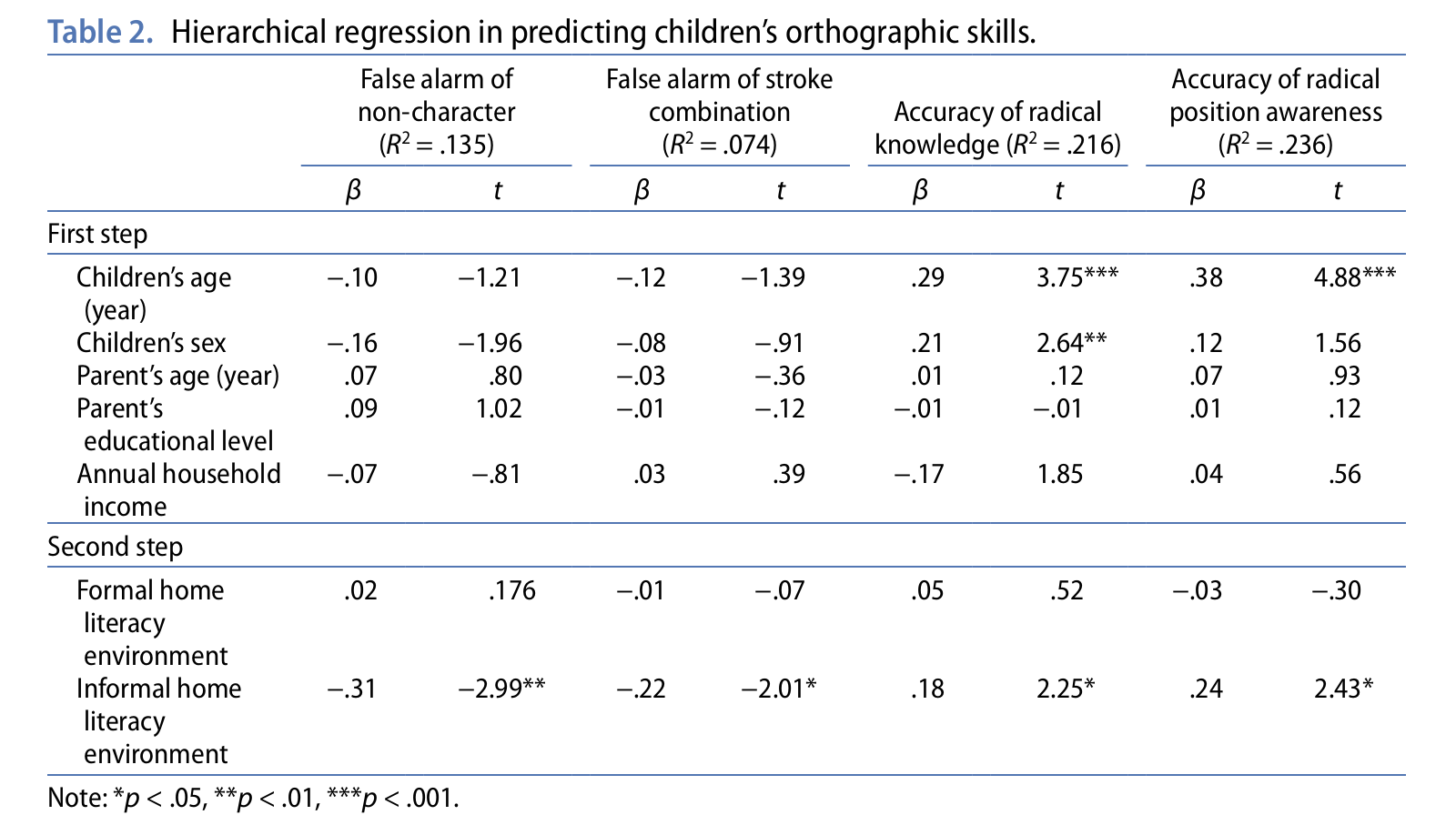 首先,研究团队以143名刚进入小学一年级的儿童为研究对象,考察了家庭读写环境与儿童正字法意识发展之间的关系。由于这些儿童大部分在入学前都没有幼儿园学习经历且在刚进入学校1个月内完成测试,可以最大化的降低学校教学的作用。研究结果显示在控制了儿童的年龄、性别、父母的年龄、受教育水平及家庭收入后,非正式的家庭读写经验与降低的非字虚报率、笔画组合虚报率以及更好的部件知识和部件位置的准确性显著相联系。表明非正式读写经验通过反复的文字暴露促进了儿童对内隐正字法规则的掌握,并由此可能支持儿童阅读能力的发展。基于该研究的论文“The relationship between the home literacy environment and development of orthographic skills in Chinese beginning readers”发表在了教育与教学研究(EDUCATION & EDUCATIONAL RESEARCH)领域的SSCI一区期刊《Language and Education》上。